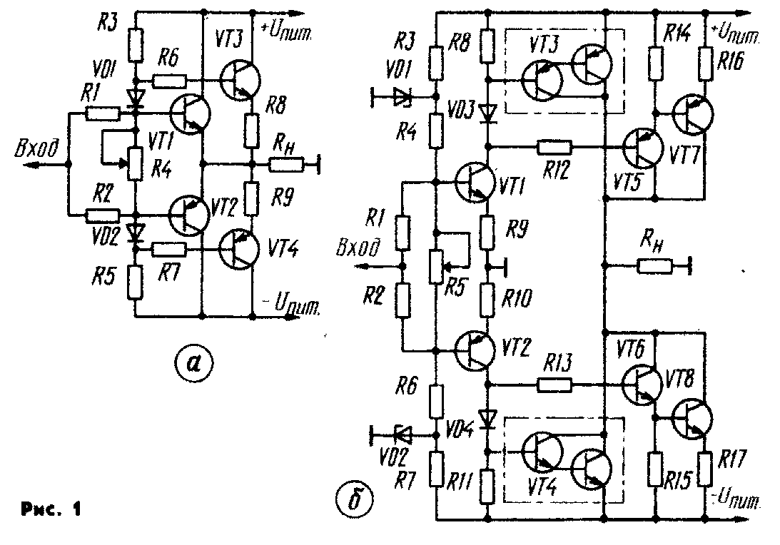 Автором предлагаются еще два варианта выходных каскадов усилителя, работающих в разных режимах и позволяющих снизить коэффициент гармоник мощного УМЗЧ. Их упрощенные электрические схемы показаны на рис. 1, а и рис. 1, б. Каждый из усилителей состоит из двух выходных каскадов — основного и вспомогательного, включенных параллельно. Причем основной каскад работает в режиме В, а вспомогательный — в режиме АВ. Основной каскад усилителя, показанного на рис. 1,а, выполнен на транзисторах VT1, VT2, включенных по схеме комплементарного эмиттерного повторителя, работающего в режиме В. Транзисторы VT3, VT4 и резисторы R6 — R9 образуют вспомогательный каскад, который работает в режиме АВ. Резисторы Rl—R5 и диоды VD1, VD2 обеспечивают необходимое смещение на базах транзисторов и задают режим работы обоих каскадов. Как видно из схемы, напряжение смещения на базах транзисторов вспомогательного каскада всегда больше, чем на базах основного каскада на величину падения напряжения на диодах VD1, VD2. В результате, если с помощью изменения сопротивления резистора R4 задать напряжение смещения на базах транзисторов VT3, VT4, соответствующее режиму АВ, то напряжение смещения на базах транзисторов VT1, VT2 будет меньше и каскад будет работать в режиме В. Резисторы R8, R9 создают необходимую термостабилизацию вспомогательного каскада, а резисторы R6, R7 ограничивают базовый ток транзисторов VT3, VT4. При малых уровнях входного сигнала транзисторы основного каскада VT1, VT2 закрыты и работает только вспомогательный каскад. При этом переменный ток, поступающий в нагрузку, мал, мало и падение напряжения на резисторах R8, R9. С ростом входного напряжения начинают открываться транзисторы VT1, VT2 и увеличивается ток, поступающий в нагрузку от включенных параллельно выходных каскадов. Увеличение тока, протекающего через резисторы R8, R9, приводит к росту падения напряжения на них и ограничению тока транзисторов VT3 и VT4. При максимальном выходном токе, например, при положительной полуволне входного напряжения, транзистор VT1 полностью открыт, а через транзистор VT3 при этом протекает в нагрузку гораздо меньший ток, ограниченный в основном резистором R8 и частично R6. Таким образом, чем больше будет сопротивление резисторов R8, R9, тем на меньшем уровне будет ограничен максимальный ток транзисторов вспомогательного каскада, а значит, и максимальная мощность в режиме АВ, отдаваемая в нагрузку. Как показало макетирование, сопротивление резисторов R8, R9 порядка 2... 10 Ом ограничивает максимальный ток транзисторов вспомогательного каскада на уровне 200...40 мА.