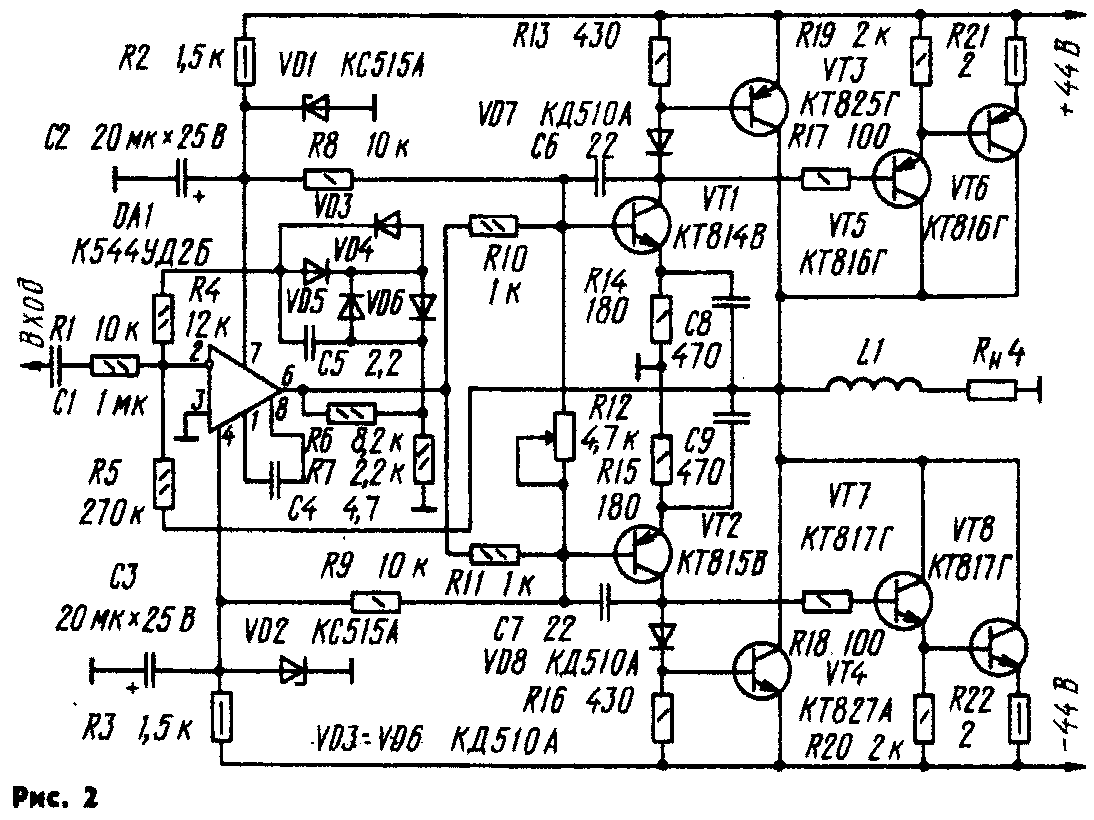 Принципиальная схема УМЗЧ приведена на рис. 2. Каскад предварительного усиления выполнен на быстродействующем ОУ DA1 (К544УД2Б), который наряду с необходимым усилением по напряжению обеспечивает устойчивую работу усилителя с глубокой ООС. Резистор обратной связи R5 и резистор R1 определяют коэффициент усиления усилителя. Выходной каскад выполнен на транзисторах VT1—VT8. Его работа была рассмотрена выше. Конденсаторы С6—С9 корректируют фазовую и частотную характеристики каскада. Стабилитроны VD1, VD2 стабилизируют напряжение питания ОУ, которое одновременно используется для создания необходимого напряжения смещения выходного каскада. Делитель выходного напряжения ОУ R6, R7, диоды VD3— VD6 и резистор R4 образуют цепь нелинейной ООС, которая уменьшает коэффициент усиления ОУ, когда выходное напряжение усилителя мощности достигнет своего максимального значения. В результате уменьшается глубина насыщения транзисторов VT1, VT2 и снижается вероятность возникновения сквозного тока в выходном каскаде. Конденсаторы С4, С5 — корректирующие. С увеличением емкости конденсатора С5 растет устойчивость усилителя, но одновременно увеличиваются нелинейные искажения, особенно на высших звуковых частотах.