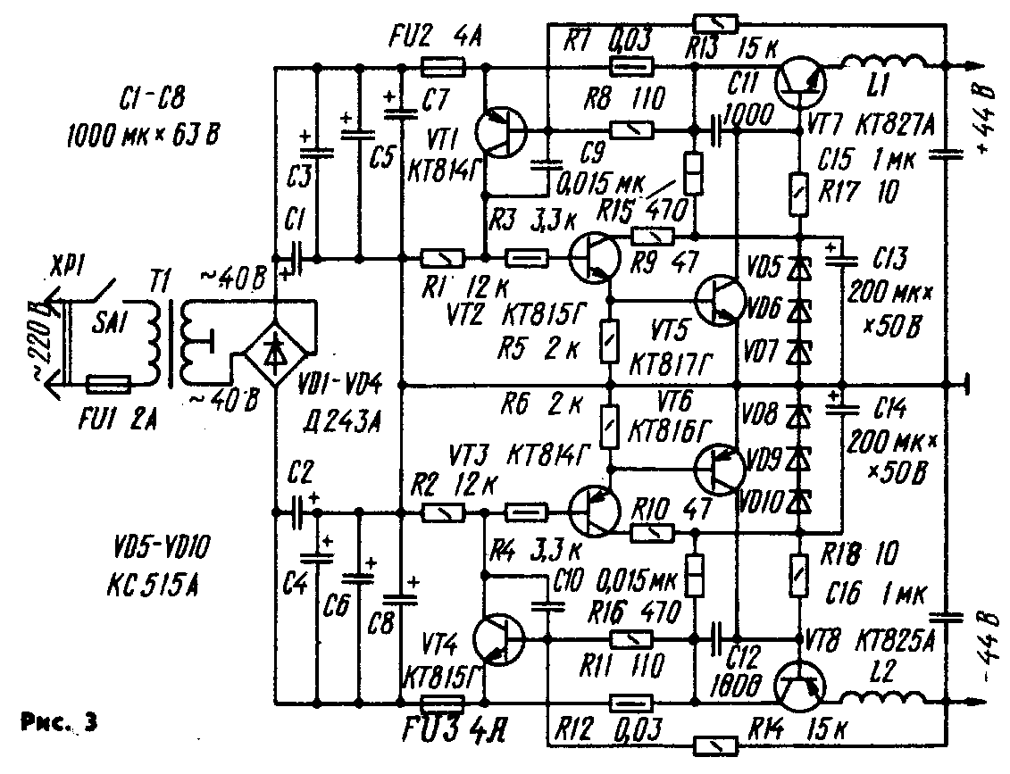 Конструкция и детали. Все детали УМЗЧ и блока питания размещены на одной плате. Исключение составляют транзисторы VT3, VT4, VT6, VT8 УМЗЧ, установленные на общем теплоотводе с площадью рассеивающей поверхности 1200 см2 и транзисторы VT7, VT8 блока питания, размещенные на отдельных теплоотводах с площадью рассеивающей поверхности 300 см2 каждый. Катушки L1, L2 блока питания (рис. 3) и L1 усилителя мощности содержат 30—40 витков провода ПЭВ-1 1,0, намотанного на корпусе резистора С5-5 или МЛТ-2. Резисторы R7, R12 блока питания представляют собой отрезок медного провода ПЭЛ, ПЭВ-1 или ПЭЛШО диаметром 0,33 и длиной 150 мм, намотанного на корпусе резистора МЛТ-1. Трансформатор питания выполнен на тороидальном магнитопроводе из электротехнической стали Э320, толщиной 0,35 мм, ширина ленты 40 мм, внутренний диаметр магнито-провода 80, наружный — 130 мм. Сетевая обмотка содержит 700 витков провода ПЭЛШО 0,47, вторичная — 2 х130 витков провода ПЭЛШО 1,2. Вместо ОУ К544УД2Б можно использовать К544УД2А, К140УД11 или К574УД1. Каждый из транзисторов КТ825Г можно заменить составными транзисторами КТ814Г, КТ818Г, а КТ827А — составными транзисторами КТ815Г, КТ819Г. Диоды VD3—VD6 УМЗЧ можно заменить любыми высокочастотными кремниевыми диодами, VD7, VD8 — любыми кремниевыми с максимальным прямым током не менее 100 мА. Вместо стабилитронов КС515А можно использовать соединенные последовательно стабилитроны Д814А (Б, В, Г, Д) и КС512А.