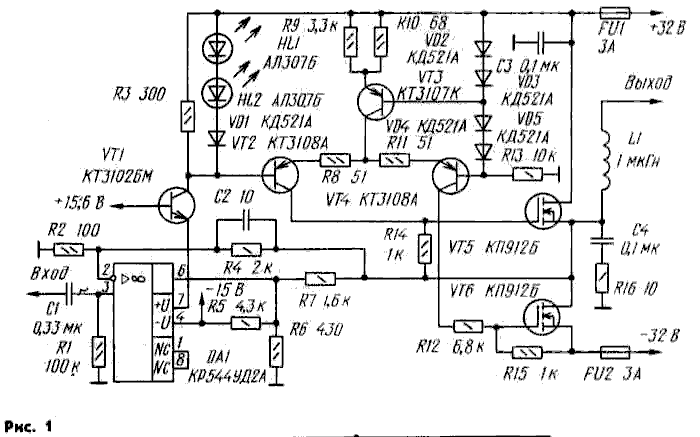 В журнале "Радио" довольно подробно рассматривались особенности построения выходных каскадов УМЗЧ на полевых транзисторах, подчеркивались их преимущества перед каскадами на биполярных транзисторах [1, 2, 3]. Однако радиолюбители берутся за их изготовление крайне редко. Связано это, на мой взгляд, не только с тем, что радикального снижения искажений во всем диапазоне воспроизводимых усилителем частот можно добиться при использовании в его выходном каскаде комплементарных пар МДП-транзисторов [4], а мощных полевых транзисторов с каналом p-типа наша промышленность пока не выпускает, но и с тем, что доступные для повторения УМЗЧ с выходными каскадами на МДП-транзисторах с каналом n-типа имеют существенные недостатки - необходимость стабилизированного источника питания [1, 2] или недостаточная выходная мощность [3]. В публикуемой ниже статье вниманию читателей предлагается описание УМЗЧ, в котором эти недостатки отсутствуют.