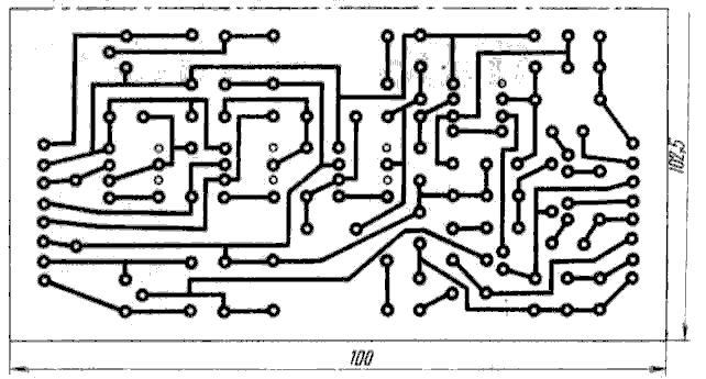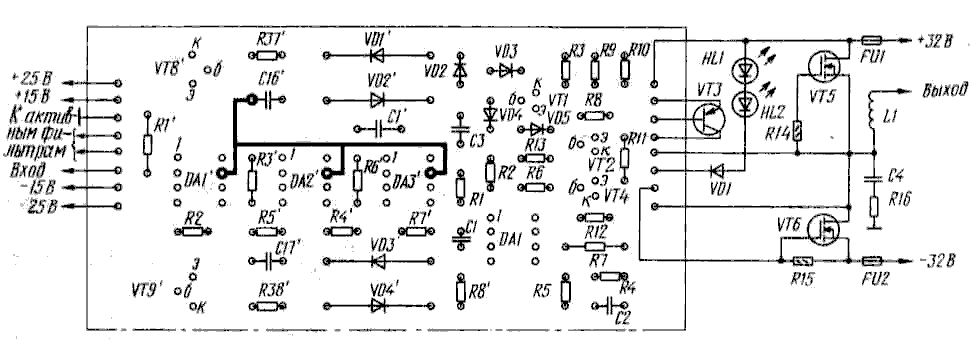 На рис.3 показана половина платы, на которой собран один канал стереофонического усилителя (детали предусилителя помечены штрихами). Вторая половина полностью ей идентична. Активные фильтры смонтированы на отдельной плате. Выходные транзисторы установлены на теплоотводах с площадью охлаждающей поверхности 400 см2. К теплоотводу транзистора VT5 приклеен транзистор VT3. Резисторы R14 и R15 припаяны непосредственно к выводам транзисторов VT5 и VT6. Светодиоды HL1, HL2 размещены на лицевой панели усилителя, фильтр R16C4L1 - у выходного разъема УМЗЧ. В усилителе можно использовать любые постоянные резисторы, нет каких-либо особых требований и к конденсаторам, за исключением работающих в предусилителе конденсаторов С2-С15, которые должны быть высокочастотными (например, К73, МБМ, МБГИ с ТКЕ М750, M1500 и отклонением емкости не более 10 %). Переменные резисторы активных фильтров (см. рис.2) - СП3-23е. Катушка L1 намотана в один слой на тороидальном каркасе с наружным диаметром 20, внутренним 10 и высотой 10 мм и содержит 28 витков провода ПЭВ-2 1,0. В предусилителе, кроме указанных на схеме, можно применить и другие универсальные ОУ. Не рекомедуется только использовать ОУ с малой скоростью нарастания выходного напряжения, такие как К140УД2 и К140УД9. Транзисторы активных фильтров КТ3102ЕМ можно заменить КТ3102Г, КТ342В. В УМЗЧ желательно использовать ОУ КР544УД2А, как самый широкополосный отечественный ОУ с внутренней частотной коррекцией. Транзисторы КТ3108А заменимы КТ313А, КТ313Б, а КП912Б-КП912А и КП913, КП920А. Налаживание УМЗЧ сводится к установке тока покоя транзисторов выходного каскада в пределах 200..300 мА подбором резисторов R9 и R10. Высокой его термостабильности можно добиться, как указывалось выше, изменением напряжения на базе транзистора VT3 подбором числа и типа диодов VD2, VD3.