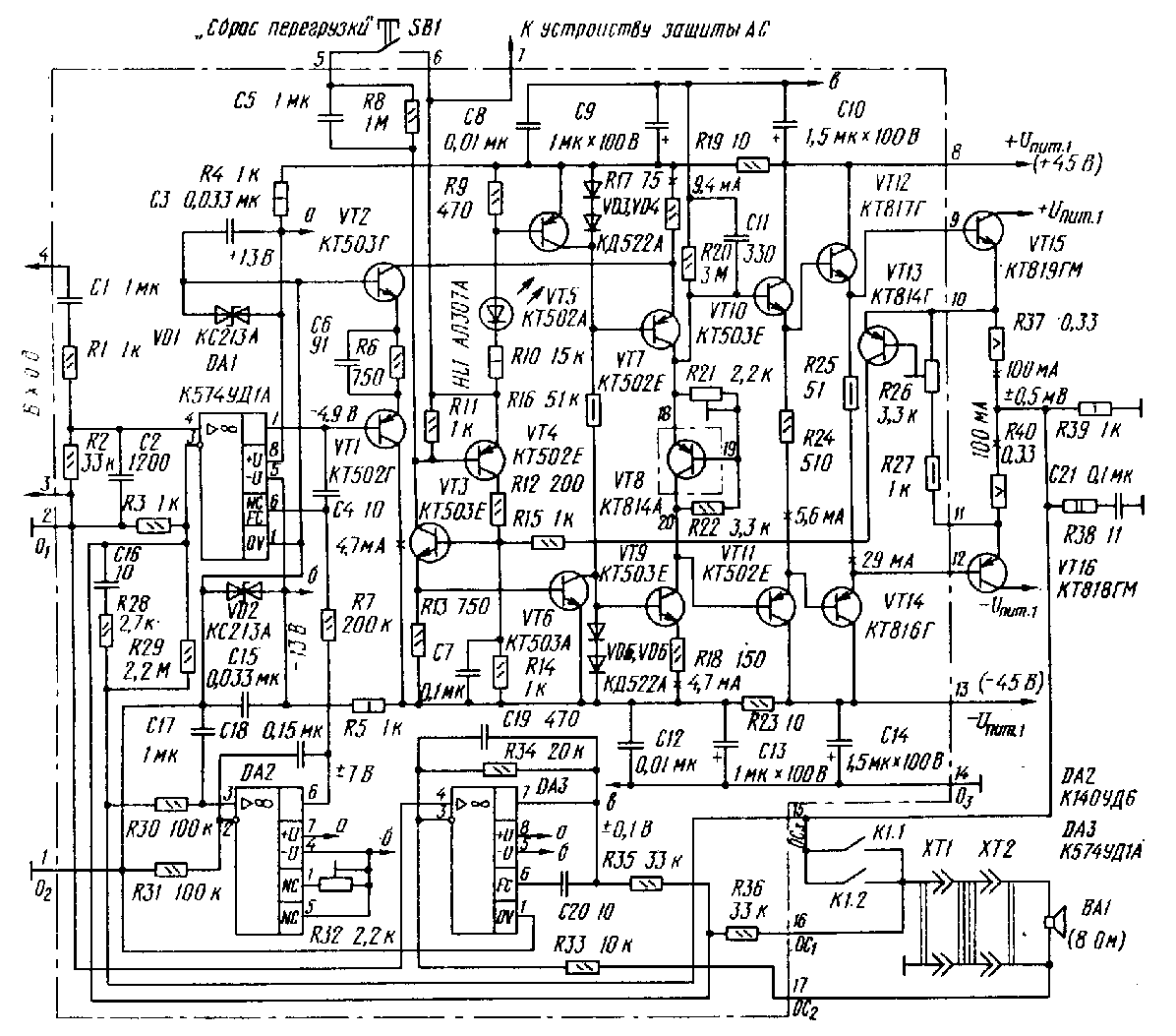 Возможная замена элементов усилителя: ОУ DA2 - К140УД7, К140УД12, К140УД14, К140УД17; DA1 - К574УД1Б, DA3 - К544УД2, К544УД1. Стабилитроны VD1, VD2 - любые маломощные на напряжение 12..14 В. Диоды VD3-VD6 - любые кремниевые маломощные, диоды устройства защиты АС (рис.3) - кремниевые маломощные с обратным напряжением не менее 50 В. Микросхему DD1 можно заменить на К561ЛЕ5, реле К1 (РЭС-22 РФ4.500.130) - РЭС-6, паспорт РФ0.452.110 или РФ0.452.100.