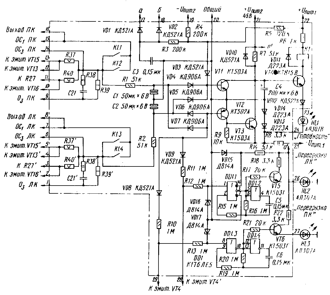 На рис.3 приведена принципиальная схема устройства защиты АС, обеспечивающего задержку подключения АС к выходу УМЗЧ при включении питания и отключение их при срабатывании триггеров защиты усилителя от токовых перегрузок, появлении на выходах аномального постоянного напряжения, снижения любого из четырех постоянных напряжений питания, а также при падении напряжения в сети переменного тока.