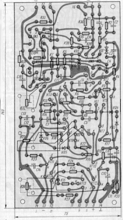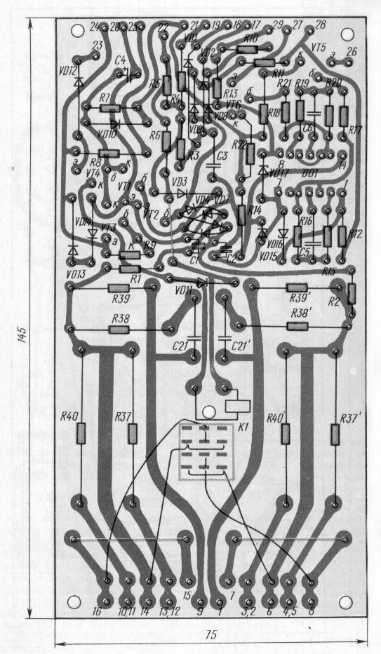 Каждый канал усилителя собран на отдельной печатной плате Чертеж печатной платы одного канала УМЗЧ показан на рис.4. Транзисторы VT12, VT13 установлены на теплоотводах из листового металла толщиной 0,5..1 мм (латунь, алюминий) площадью 6 см2.