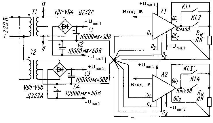 С целью уменьшения низкочастотных межканальных помех и искажений каждый канал УМЗЧ питается от отдельного нестабилизированного источника. Питающие напряжения зависят от необходимой выходной мощности, сопротивления нагрузки и могут быть установлены без каких-либо изменений схемы в диапазоне от ±25 до ±45 В. Требуется только замена реле устройства защиты АС (см. ниже) на более низкоомное. Для выбора питающих напряжений можно воспользоваться формулой Uпит=5+(2*Pн*Rн)1/2, где Pн - номинальная мощность в нагрузке, Rн - номинальное сопротивление АС. Емкость конденсаторов сглаживающего фильтра выпрямителей каждого канала должна быть не менее 2?10000 мкФ при Рн>40 Вт и 2?6000 мкФ при Рн<40 Вт.