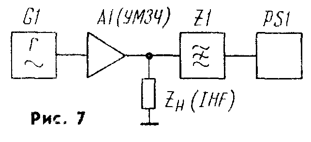 Все испытания, кроме измерения выходной мощности, проводились на эквивалент нагрузки по стандарту IHF (см. рис. 3 в статье автора «К вопросу об оценке нелинейных искажений УМЗЧ» в «Радио», 1989, № 5, с. 54—57). Схема измерения коэффициента гармоник показана на рис. 7. Коэффициент гармоник измерялся спектроанали-затором СК4-56 (PS1), в качестве источника сигнала использовался генератор ГЗ-118 (G1). Для увеличения разрешающей способности измерений первая гармоника сигнала с выхода УМЗЧ подавлялась на 60...62 дБ режекторным фильтром ЕХ2.067.075 (Z1), входящим в комплект поверки генератора ГЗ-118. Точность таких измерений определяется собственным коэффициентом гармоник генератора. У прибора, которым пользовался автор, уровень гармоник не превышал — 110 дБ (Кг<0,00032 %) на частоте 1 кГц и —100 дБ (Кг< <0,001 %) на частоте 10 кГц.