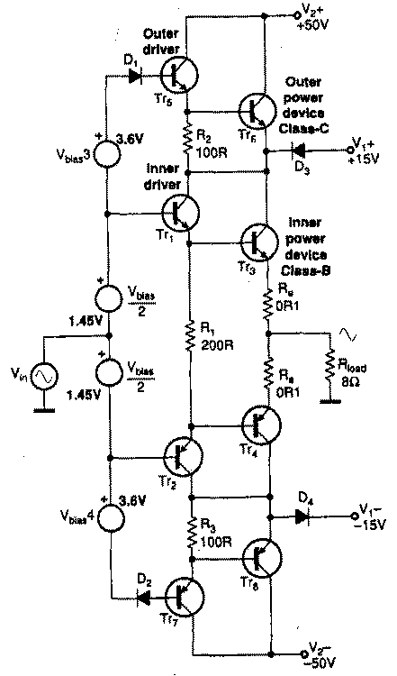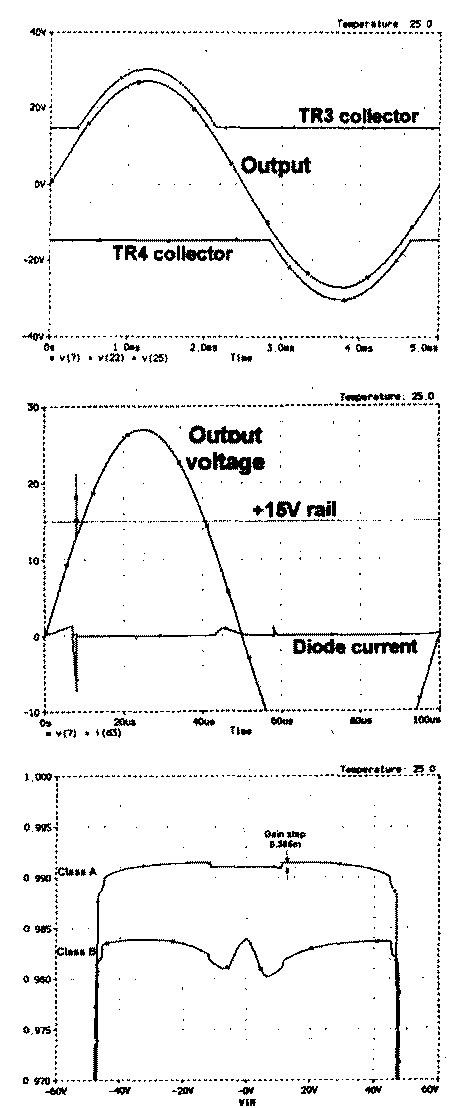 Действительно, изменяемое довольно резко питание «внутренних» драйверов ТгЗ, Тг4 в типовой схеме выходного каскада класса G (рис. 1) при достижении некоторого порога (обычно от 1/3 до половины максимальной) значительно повышает КПД усилителя (при мощности ниже пороговой - в несколько раз) и разгружает по рассеиваемой мощности ТгЗ, Тг4, но в моменты перехода с постоянного питания через диоды D3,D4 на динамическое через Тг6, Тг8 возникают кратковременные пики выходного напряжения (рис.3), не улучшающие звучание. Известный английский HiFi-конструктор Дуглас Селф путем моделирования в SPICE определил, что «пики» возникают в моменты отключения диодов, которые должны пропускать большой ток и поэтому мощные и инерционные. Из-за огромного времени рассасывания основных носителей такие диоды закрываются сравнительно медленно, из-за чего и возникают пики напряжения - на рис.3 хорошо видно, что пик на выходном напряжении появляется сразу за окончанием броска запирающего тока через диод. Этот ток «запускается» в диод с эмиттера Тг6, но после того, как диод закрылся, ток эмиттера продолжает некоторое время поступать (на этот раз из-за инерционности Тг6), но уже не в закрытый D3, а через емкость коллектор-эмиттер ТгЗ - прямиком в нагрузку. Поиски решения проблемы привели Дугласа к современным мощным диодам Шоттки, имеющим быстродействие выше, чем у транзисторов: первый же эксперимент с Мотороловскими MBR5025L (предельный прямой ток до 50 А) как в симуляторе SPICE, так и на «живом» макете показал полное исчезновение паразитных всплесков. Следующий логический шаг, сделанный в направлении HiFi-применения схемотехники класса G - перевод внутренних транзисторов ТгЗ, Тг4 в режим класса А. Такое решение позволяет обеспечить линейность выше, чем в обычном классе В или АВ при существенной лучшей экономичности.
