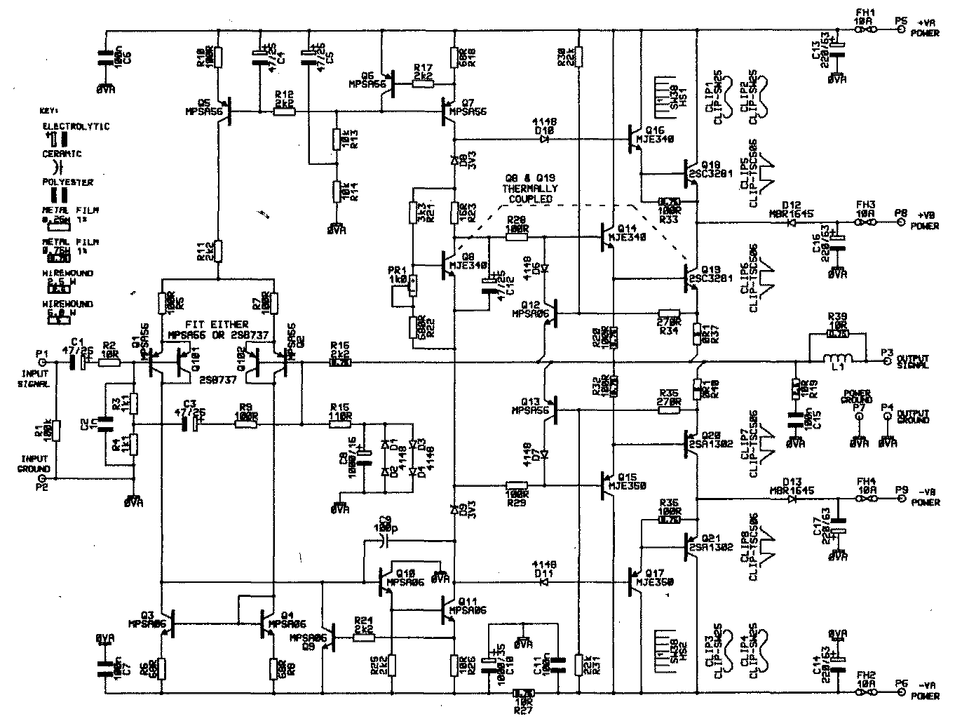 Такое решение снижает уровень собственных шумов, а также смещение нуля по постоянному току, вызванное протеканием разности токов баз Q1Q101, Q2Q102 через R3+R4 и R16. Для того, чтобы R3 и R4 не ограничивали входное сопротивление усилителя малоприемлемыми 2 килоомами, через СЗ в их общую точку инжектируется напряжение с базы Q2, которое повышает RBX до 15 кОм. Резисторы R5 и R7, а также относительно большой ток коллекторов транзисторов входного каскада (6 мА) уменьшают проявление нелинейности третьего порядка, а токовое зеркало Q3Q4 предотвращает дисбаланс токов коллектора пар Q1Q101, Q2Q102, а также появление на выходе этого каскада четных гармоник (они компенсируются). Каскад усиления напряжения Q11 с целью предотвращения вредного шунтирования выхода первого каскада его емкостью Миллера предварен эмиттерным повторителем Q10. Термостабилизирующий Q8 смонтирован непосредственно на корпусе Q19 (не на радиаторе!). Единственный пункт в процедуре налаживания - установка резистором PR1 начального тока эмиттера Q19(Q20) 1,5 А. Нижняя граница АЧХ по уровню -3 дБ составляет 1,4 Гц, верхняя - определяется выходным сопротивлением источника сигнала и емкостью С2 (в типовом случае от 100 до 200 кГц), скорость изменения выходного напряжения 40 В/мкс. Выходные транзисторы необходимо монтировать на радиаторах с тепловым сопротивлением не более 2°С/Вт.