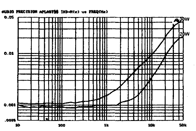 Здесь входные каскады практически заимствованы из хорошо зарекомендовавшей себя разработки Дугласа 2000-го года - изменен только выходной каскад. При напряжениях питания ±VR = ±50 В («внешнее») и +VB = ±15 В («внутреннее») усилитель отдает в 8-омную нагрузку до 120 Вт, а переход к «внешнему» питанию происходит при мощности около 25 Вт (при меньшей мощности усилитель работает в чистом «настоящем» режиме класса А). На рис.6 показаны зависимости коэффициента гармоник от частоты при выходной мощности 20 и 30 Вт, т.е. ниже и выше порога переключения. Из других схемных особенностей можно отметить применение во входном дифкас-каде спаренного включения транзисторов Q1Q101Q2Q102, а также низкоомного делителя в цепи ООС (обычно сопротивления резисторов R15, R16 на порядок больше).