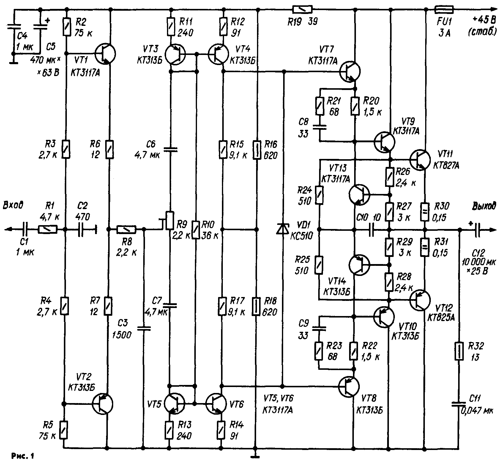 Проблема снижения нелинейных искажений звуковоспроизводящего тракта и, в частности повышения линейности усилителей мощности 34 (УМЗЧ) уже давно волнует как профессиональных, так и самодеятельных конструкторов бытовой радиоаппаратуры. О том, какое значение коэффициента гармоник (Кг) можно считать допустимым для высококачественного УМЗЧ, высказано множество мнений, порой весьма противоречивых [1]. Однако известно, что наибольший вклад в искажения тракта обычно вносят акустические системы (Кг > 3 %) и магнитофон или ЭПУ (Кг - 1...3%).