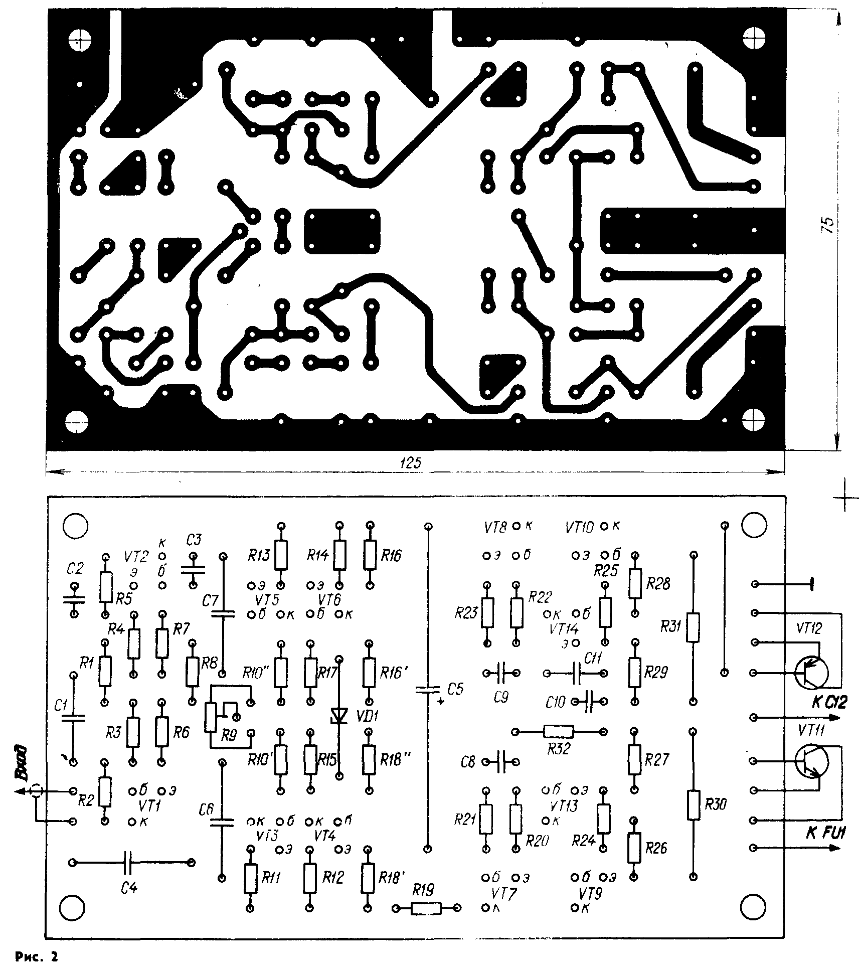 Конструкция и детали. Все детали УМЗЧ, кроме транзисторов VT11, VT1 2 смонтированы на печатной плате (см. рис. 2), изготовленной из фольгиро-ванного стеклотекстолита толщиной 1,5 мм. Каждый из транзисторов оконечного каскада установлен на теплоотводе с площадью охлаждающей поверхности около 300 см2. Вместо указанных на схеме транзисторов КТ3117А можно применить транзисторы серии КТ503, вместо КТ313Б — транзисторы серии КТ502. Конденсаторы С1, С4, С6, С7, С11 - К73-17, С5 — К50-24, остальные — керамические любого типа. Использовать в качестве С6, С7 оксидные конденсаторы нежелательно, так как это может привести к увеличению коэффициента гармоник. В УМЗЧ применен подстроечный резистор СП5-16В, постоянные резисторы С5-16 (R30, R31) и МЛТ (остальные). Для удобства монтажа резисторы R16 и R18 составлены каждый из двух резисторов МЛТ-0,25 сопротивлением 300 Ом.