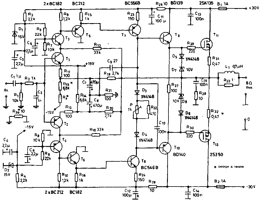 Верхний предел напряжения вторичной обмотки трансформатора определяется типом использованных транзисторов Т7, Т8. В случае использования пары ВС 546/556, напряжение питания (в отсутствие сигнала) не должно превосходить 30...32 В. Более высокое напряжение эти транзисторы "переносят плохо". При напряжении питания ±30 В можно использовать трансформатор 220/2х22,5 В или 230/2х24 В. Усилитель с напряжением питания ±30 В может отдать в нагрузку мощность около 24 Вт (на 8 Ом). Полевые транзисторы, используемые в оконечном усилителе, очень дорогие. За цену одного такого транзистора можно приобрести весь остальной набор деталей. Невольно возникает вопрос- компенсируются ли излишки расходов ожидаемым улучшением качества. Ответ на этот вопрос зависит от многих обстоятельств, поскольку: