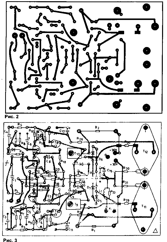 Монтаж. Усилитель собран на двусторонней печатной плате, чертеж которой показан на рис.2-3. Со стороны деталей имеется сплошная фольга заземления. Зенковка в местах "входа" выводов деталей в плату предотвращает замыкания. Соединяющиеся с землей выводы деталей припаиваются непосредственно (без отверстий) к фольге заземления. На сборочном чертеже эти точки помечены черным цветом. Два оконечных полевых транзистора устанавливаются на уголки из алюминия, которые соединяются с радиатором, создавая тепловой мостик, и оба крепятся к плате. Их необходимо изолировать от уголков и платы. Имеющийся в цепи эмиттера резистор "висит в воздухе", поскольку установлен навесным монтажом. Резисторы R29 и R30 для укорачивания выводов припаиваются со стороны дорожек платы. Теплоотводы не должны образовывать с "нулевой" фольгой "ложную землю", поэтому "нулевая" фольга прерывается глубокой царапиной, идущей параллельно теплоотводам. Для нормального охлаждения полевых транзисторов достаточно охлаждающей поверхности около 400 см2. Транзисторы Т9 и Т10 крепятся к "нулевой" фольге через тонкую слюдяную пластину. Здесь очень легко может возникнуть короткое замыкание, поэтому монтаж нужно тщательно проверить омметром. Катушка L1 диаметром 10 мм состоит из примерно 15 плотно намотанных витков провода диаметром 0,5 мм (без сердечника). Резистор R33 расположен по оси L1, и его выводы спаиваются вместе с выводами катушки, а затем крепятся к плате. Три провода, идущие к блоку питания, скручиваются вместе. Два провода, ведущие к динамику, также скручиваются в отдельный жгут (независимо от предыдущих). Поскольку здесь текут большие токи, их магнитные поля могут значительно увеличить искажения - главным образом, на высоких частотах. Скручивание проводов вместе приводит к тому, что магнитные поля токов, текущих в противоположных направлениях, взаимно уничтожаются. Нулевая точка блока питания и вывод динамика не соединяются с корпусом, и идущие к ним провода не укладываются вместе с другими проводами.