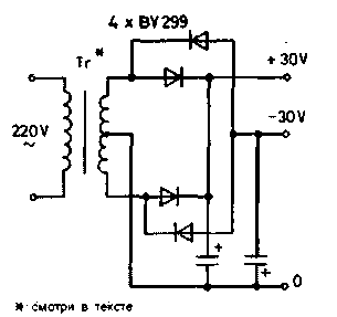 Блок питания. Схема блока питания - самая простая (рис.4). Трансформатор, имеющий отвод от середины вторичной обмотки, питает двухполупериодный выпрямитель, состоящий из двух групп по 2 диода. Сглаживание пульсации осуществляют конденсаторы емкостью не менее 4700 мкФ (40 В). Такой блок может обеспечить питанием два оконечных усилителя.