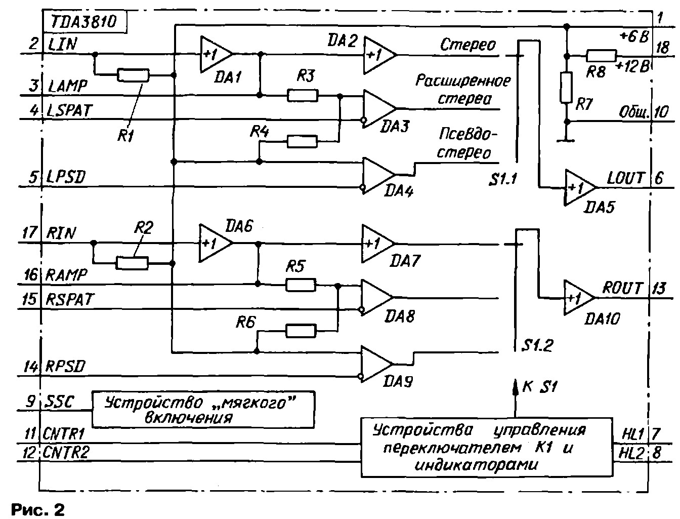 Микросхема TDA3810 предназначена для работы в каналах ЗЧ радио- и телевизионных приемников, а также а другой звуковоспроизводящей аппаратуре. Она обеспечивает три режима — "Стерео", "Расширенное стерео" и "Псевдостерео". В первом оба канала процессора имеют единичный коэффициент передачи, т. е. работают повторителями напряжения. Во втором — в каждый канал добавляется а противофазе сигнал из соседнего канала, что субъективно расширяет стереобазу. Третий режим предназначен для преобразования монофонического сигнала в псевдостереофонический.