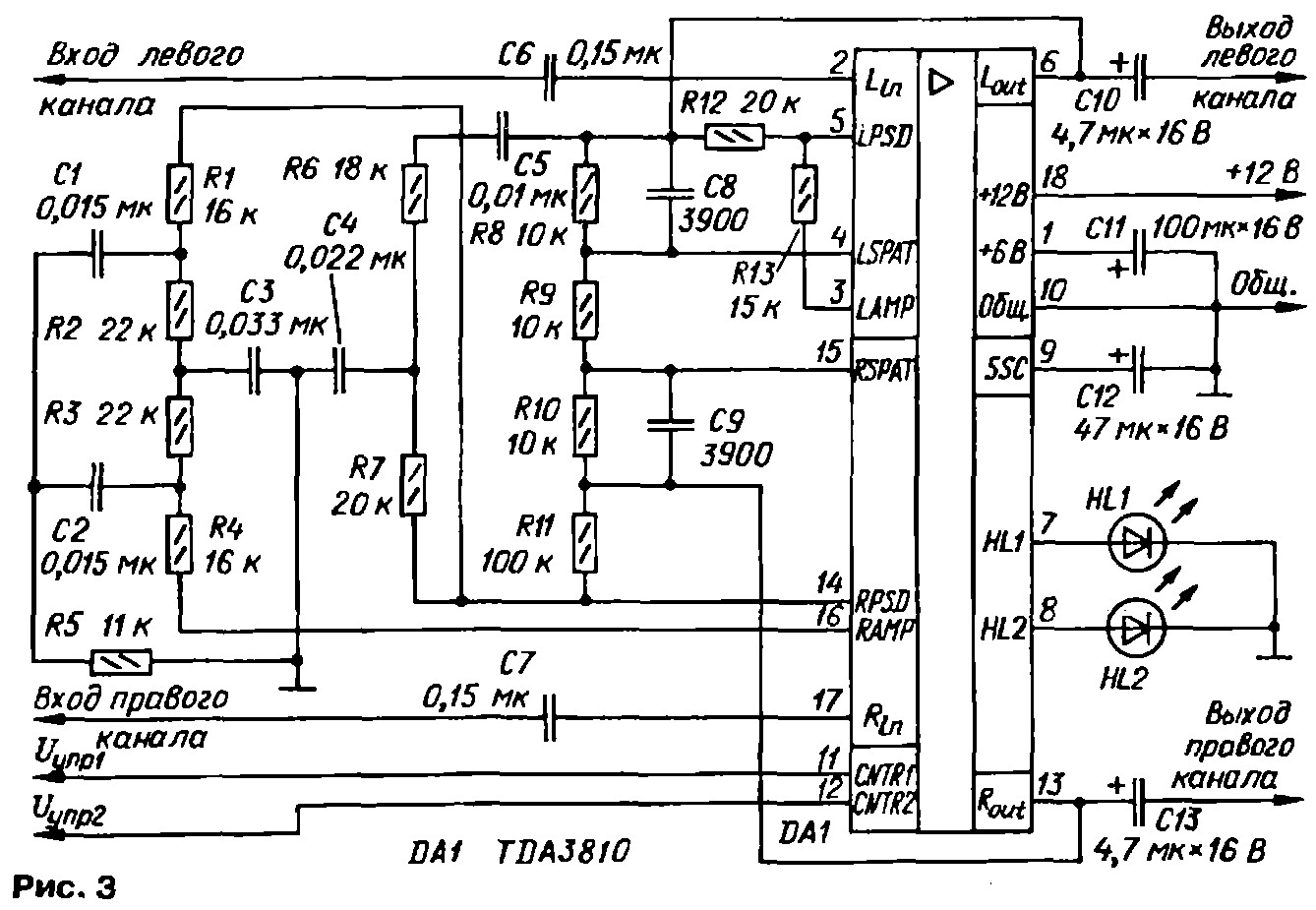 Функциональная схема, представленная на рис. 5, соответствует режиму "Расширенное стерео". Коэффициент передачи со входа левого канала на его выход равен 0,66(1+R8/R9). где 0,66 — коэффициент передачи подключенного к неинвертирующему входу ОУ DA3 внутреннего резистивного делителя процессора, a R8 и R9 — сопротивление внешних резисторов R8 и R9, входящих во входную фильтровую цепь. При указанных на рис. 3 номиналах этих резисторов коэффициент передачи равен 1,32 (2,4 дБ). Коэффициент же передачи от входа левого канала до выхода правого отрицателен и равен -0.66R10/R9=-0,66. На высших частотных составляющих звукового сигнала, где емкостное сопротивление конден-свторов С8 и С9 значительно меньше сопротивления внешних резисторов R8 и R10, сигналы на выходах каналов повторяют с коэффициентом 0,66 сигналы с их входов. Условной частотной границей разделения, ниже которой стерео-базв расширяется, а выше нет, можно считвть значение 1/2nR8C8=4 кГц. Если конденсаторы С8 и С9 не устанввли-ввть, стереобаза будет расширяться во всей звуковой частотной полосе.