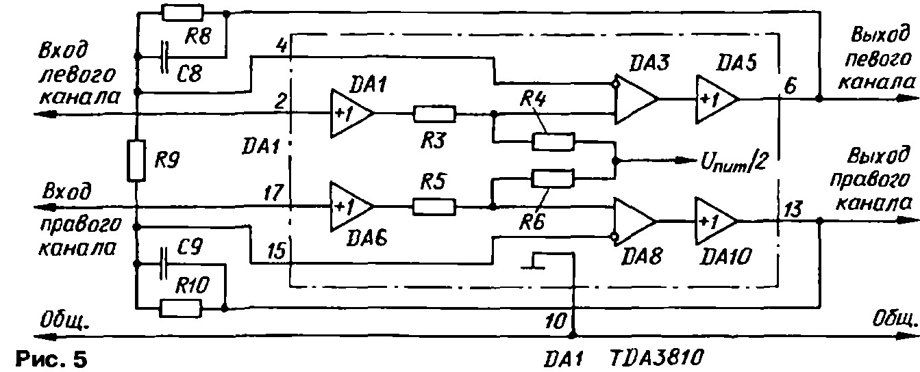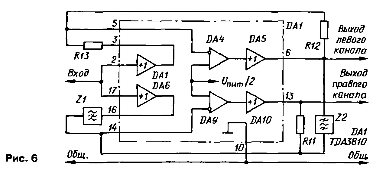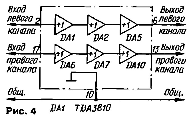 На рис. 4 показана структурная схема процессора TDA3810, работающего в режиме "Стерео". Коэффициент передачи обоих каналов в этом случае равен 1.