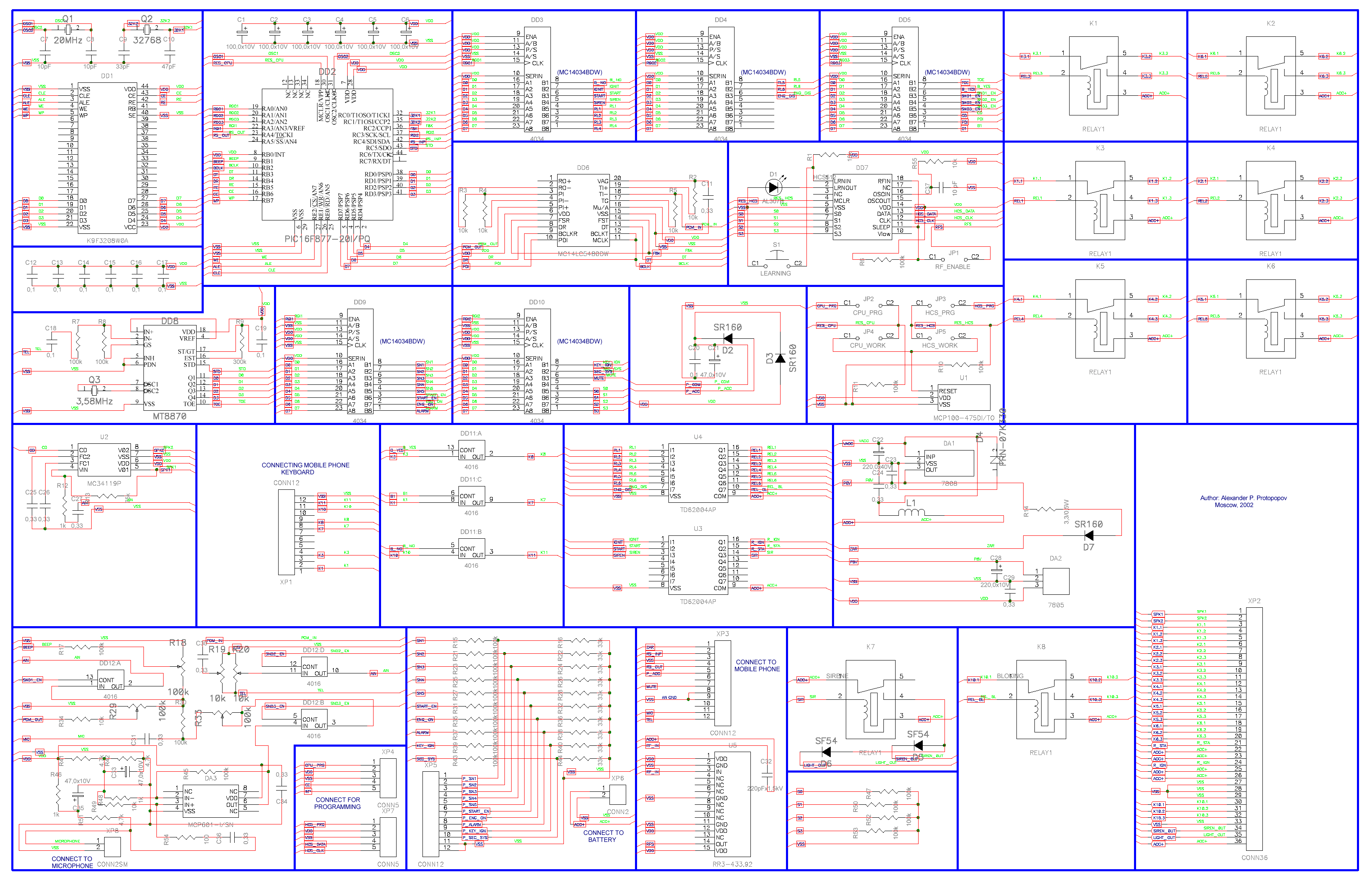 Применен управляющий микроконтроллер PIC16F877 (Microchip), работающий с тактовой частотой 20MHz. Для записи и воспроизведения голоса установлен PCM-кодек MC14LC5480DW (Motorola) и микросхема памяти NAND FLASH K9F3208W0A (Samsung). Объема памяти указанной микросхемы достаточно для записи 64-х сообщений длительностью до 8 секунд при плотности записи 8000 байт в секунду. При этом обеспечивается весьма высокое качество воспроизводимого голоса. Система управляет встроенным мобильным телефоном GSM-стандарта Ericsson A1018S. Альтернативное управление некоторыми функциями производится с брелка "прыгающим" кодом KeeLoq. Используются микросхемы CD4034 (MC14034BDW) в качестве расширения портов ввода-вывода. Применены коммутаторы CD4016 (MC14016) для переключения звуковых каналов, управляемый телефонный усилитель MC34119, DTMF-приемник MT8870 (SM8870), дешифратор KeeLoq-кода HCS512 (Microchip), сборки мощных транзисторных ключей TD62004AP (Toshiba) для непосредственного управления реле, RF-приемник RR10 (Telecontrolli) на частоту 433,92 MHz, экономичный операционный усилитель MCP601-I/SN (Microchip) для усиления сигнала от микрофона, герметичные реле для управления нагрузками.