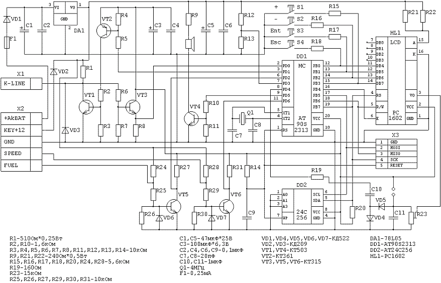 Информация отображается на знакосинтезирующем, русифицированном, жидкокристаллическом индикаторе HL1 с 2 строками по 16 символов со светодиодной подсветкой и расширенным температурным диапазоном. Обмен информацией между микроконтроллером и индикатором производится по 4-разрядной шине с формированием данных и управляющих сигналов программным путем. Кроме того, к этой же шине через резисторы R15..R18, предотвращающие возможный на ней конфликт, подключены кнопки управления S1..S4. Опрос клавиатуры производится в моменты времени, когда нет обмена с индикатором, при этом уровень логической "1" обеспечивается за счет внутренних подтягивающих резисторов микроконтроллера, а уровень "0" возникает при замыкании кнопки на землю. Программно реализовано подавление дребезга контактов и защита от импульсных помех. Т.к. обращения к индикатору и последовательной памяти разнесены во времени, то для экономии выводов микроконтроллера вывод PB7 порта B используется ими совместно. Для питания драйверов индикатора с расширенным температурным диапазоном требуется отрицательное напряжение -3..-4 В, получаемое путем выпрямления переменного напряжения частотой приблизительно 8 кГц (меандровые импульсы формируются микроконтроллером) с помощью элементов R19, C10, VD4, VD5, C11. В случае применения индикатора с обычным температурным диапазоном элементы R19, C10, VD4, VD5 необходимо исключить и установить перемычку X4. Переменный резистор R23 позволяет задать требуемый уровень контрастности. Питание на подсветку подается постоянно при включении ключа зажигания, ток через светодиоды ограничен резисторами R21, R23.