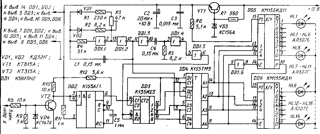 В журнале "Радио" был описан квазианалоговый автомобильный бортовой тахометр [1]. Шкала этого прибора по способу индикации относится к типу "бегающая точка", т.е. текущее значение измеряемого параметра в любой момент высвечивает один светодиод шкалы, а остальные выключены. Такая шкала зрительно хорошо имитирует стрелку, отличается малым потреблением тока, но ее показания трудно считывать при дневном свете из-за недостаточной яркости. Как показывает практика, большее удобство обеспечивает линейная шкала, у которой каждому дискретному значению измеряемого параметра соответствует определенная длина линейки включенных светодиодов. Такая шкала находит широкое применение в бытовой звукоусилительной технике для индикации уровня выходного сигнала. Линейная шкала позволяет водителю оценить частоту вращения коленчатого вала двигателя автомобиля даже при беглом взгляде на панель приборов. Описанный ниже квазианалоговый тахометр оснащен линейной светодиодной шкалой. По остальным показателям он аналогичен описан ному в [1].