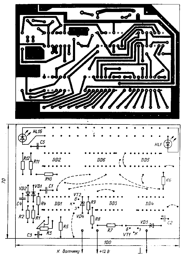 Чертеж печатной платы тахометра изображен на рис.2. Вместо транзистора КТ815А можно применить любой из этой серии. Транзистор КТ315А можно заменить любым из серии КТ315.