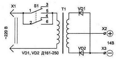 Сама схема пускового устройства довольно проста, но требует правильного изготовления сетевого трансформатора. Для него удобно использовать тороидальное железо от любого ЛАТРА — при этом получаются минимальные габариты и вес устройства. Периметр сечения железа может быть от 230 до 280 мм (у разных типов автотрансформаторов он отличается). Перед намоткой обмоток необходимо закруглить напильником острые края на гранях магнитопровода, после чего его обматываем лакотканью или стеклотканью. Первичная обмотка трансформатора содержит примерно 260...290 витков провода ПЭВ-2 диаметром 1,5...2,0 мм (провод может быть любого типа с лаковой изоляцией). Намотка распределяется равномерно в три слоя, с межслойной изоляцией. После выполнения первичной обмотки, трансформатор необходимо включить в сеть и замерить ток холостого хода. Он должен составлять 200...380 мА. При этом будут оптимальные условия трансформации мощности во вторичную цепь. Если ток будет меньше, часть витков надо отмотать, если больше — домотать до получения указанной величины. При этом следует учитывать, что зависимость между индуктивным сопротивлением (а значит и током в первичной обмотке) и числом витков является квадратичной — даже незначительное изменение числа витков будет приводить к существенному изменению тока первичной обмотки. При работе трансформатора в режиме холостого хода не должно быть нагрева. Нагрев обмотки говорит о наличии межвитковых замыканий или же продавливании и замыкании части обмотки через магнитопровод. В этом случае намотку придется выполнять заново. Вторичная обмотка наматывается изолированным многожильным медным проводом сечением не менее 6 кв. мм (например типа ПВКВ с резиновой изоляцией) и содержит две обмотки по 15... 18 витков. Наматываются вторичные обмотки одновременно (двумя проводами), что позволяет легко получить их симметричность — одинаковые напряжения в обоих обмотках, которое должно находиться в интервале 12...13,8 В при номинальном сетевом напряжении 220 В. Измерять напряжение во вторичной обмотке лучше на временно подключенном к клеммам Х2, ХЗ нагрузочном резисторе сопротивлением 5...10 Ом. Показанное на схеме соединение выпрямительных диодов позволяет использовать металлические элементы корпуса пускового устройства не только для крепления диодов, но и в качестве теплоотвода без диэлектрических прокладок ("плюс" диода соединен с крепежной гайкой). Для подключения пускового устройства параллельно аккумулятору, соединительные провода должны быть изолированными и многожильными (лучше, если медные), с сечением не менее 10 кв. мм (не путать с диаметром). На концах провода, после облуживания, припаиваются соединительные наконечники. Контакты включателя S1 должны быть рассчитаны на ток не менее 5 А, например типа ТЗ.