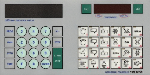 Оператор имеет возможность занести в память устройства до десяти разных программ длиной до 51-го шага и запускать их на выполнение нажатием всего двух кнопок. В каждом шаге может программироваться значение температуры для первого термостата, а также включение и выключение любых электрических аппаратов на любое значение времени. Второй термостат работает полностью независимо и постоянно поддерживает заданную температуру. Для некоторых аппаратов введен контроль аварийных датчиков и автоматическое управление аппаратами в зависимости от их состояния. Сообщения о срабатывании датчиков выводятся на дисплей. Помимо основных аппаратов, мнемонические обозначения которых имеются на клавиатуре, к устройству можно подключить до восьми дополнительных аппаратов с контрольными датчиками, состояние которых будет управлять работой этих аппаратов. В режиме выполнения программы пользователя на дисплее показывается номер выполняемого шага программы, время до его окончания и сообщение о нормальном режиме работы устройства или сообщения о срабатывании аварийных датчиков. При работе в режиме ручного управления, пользователь имеет возможность просмотреть время работы любого из включенных аппаратов, а время работы последнего включенного аппарата постоянно выводится на дисплей. Устройство имеет встроенные часы реального времени с высокой точностью хода. В качестве дисплея применен жидкокристаллический модуль с организацией 16 символов на две строки. Для индикации реальных (измеренных) значений температур для первого и второго термостатов применены дополнительные семисегментные светодиодные модули. Для управления устройством используется пленочная клавиатура с числом клавиш равным 45-ти.