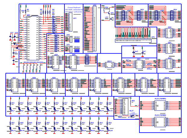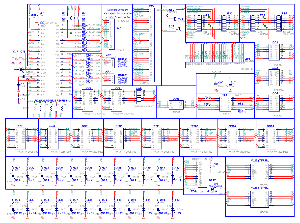 В качестве управляющего использован микроконтроллер Microchip PIC16F877-20I/P, для вывода информации применен LCD-модуль Powertip PC1602LRS-LNH-B, использованы семисегментные LED-модули YDD-040CG, температурные датчики Dallas DS1621, FLASH-память Microchip 24LC65, двунаправленные порты PCF8574P фирмы Philips с обменом по шине I2C. В качестве основных портов вывода применены регистры 74ALS374. Они обеспечивают необходимые токи управления для последующего подключения твердотельных реле. Схема питается от источника с напряжением +5V.