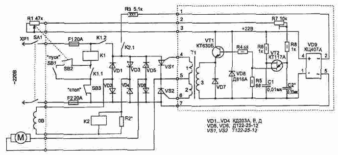 Приведенная схема позволяет обеспечить необходимый режим работы — плавный запуск и ручную установку нужной частоты вращения ЭМ. Направление вращения изменится, если поменять полярность подключения проводов на обмотке возбуждения или якоре (делается это обязательно только при выключенном ЭМ). В схеме применены два реле, что позволяет выполнить автоматическую защиту элементов схемы от перегрузки. Реле К1 является мощным пускателем, оно исключает вероятность включения ЭМ при установленной резистором R1 не нулевой начальной скорости. Для этого на оси переменного резистора R1 закрепляется рычаг, связанный с кнопкой SB2, которая замыкается (рычагом) только при максимальном значении сопротивления (R1) — это соответствует нулевой скорости. Когда замкнуты контакты SB2, реле К1 при нажатии кнопки ПУСК (SB1) включится и своими контактами К1.1 самоблокируется, а контакты К1.2 включат электропривод. Реле К2 обеспечивает защиту от перегрузки при отсутствии тока в цепи обмотки возбуждения ЭМ. В этом случае контакты К2.1 отключат питание схемы. Питается схема управления без трансформатора, непосредственно от сети через резистор R3. Величина действующего значения напряжения на якорной обмотке устанавливается с помощью изменения резистором R1 угла открывания тиристоров VS1 и VS2. Тиристоры включены в плечи моста, что уменьшает число силовых элементов в схеме. На однопереходном транзисторе VT2 собран генератор импульсов, синхронизированных с периодом пульсации сетевого напряжения. Транзистор VT1 усиливает импульсы по току, и через разделительный трансформатор Т1 они поступают на управляющие выводы тиристоров. При выполнении конструкции тиристоры VS1, VS2 и диоды VD5, VD6 необходимо установить на теплоотводящую пластину (радиатор).