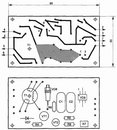 Часть схемы управления, выделенная на рисунке пунктиром, размещается на печатной плате. Постоянные резисторы применены типа С2-23, переменный R1 — типа ППБ-15Т, R7 — СПЗ-196, R3 — типа ПЭВ-25. Конденсаторы С1 и С2 любого типа, на рабочее напряжение не менее 100 В. Выпрямительные диоды VD1 ...VD4 на ток 10 А и обратное напряжение 300 В, например Д231 Д231А Д232,Д232А,Д245,Д246. Импульсный трансформатор Т1 выполнен на ферритовом кольце М2000НМ типоразмера К20х12х6 мм и намотан проводом ПЭЛШО диаметром 0,18 мм. Обмотка 1 и 2 содержат по 50 витков, а 3 — 80 витков. Перед намоткой, острые грани сердечника нужно закруглить надфилем, чтобы исключить продавливание и замыкание витков. При первоначальном включении схемы замеряем ток в цепи обмотки возбуждения (0В) и по закону Ома рассчитываем номинал резистора R2 так, чтобы срабатывало реле К2. Реле К2 может быть любым низковольтным (6...9 В) — чем меньше напряжение срабатывания, тем лучше. При выборе резистора R2 необходимо учитывать также рассеиваемую на нем мощность. Зная ток в цепи 0В и напряжение на резисторе, ее легко посчитать по формуле P=UI. Вместо К2 и R2 лучше применять выпускаемые промышленностью специальные токовые реле, но они из-за узкой области применения не всем доступны. Токовое реле несложно изготовить самостоятельно, намотав на большем герконе примерно 20 витков проводом ПЭЛ диаметром 0.7...1 мм. Для настройки схемы управления вместо якорной цепи мотора подключаем лампу мощностью 300...500 Вт и вольтметр. Необходимо убедиться в плавном изменении напряжения на лампе резистором R1 от нуля до максимума. Иногда, из-за разброса параметров однопереходного транзистора, может потребоваться подбор номинала конденсатора С2 (от 0,1 до 0,68 мкФ) и резистора R7 (R7 устанавливает при минимальном значении сопротивления R1 максимум напряжения на нагрузке). Если при правильном монтаже не открываются тиристоры, то необходимо поменять местами выводы во вторичных обмотках Т1. Неправильная фазировка управляющего напряжения, приходящего на тиристоры VS1 и VS2, не может их повредить. Для удобства контроля работы тиристоров управляющее напряжение допустимо подавать сначала на один тиристор, а потом на другой — если регулируется резистором R1 напряжение на нагрузке (лампе), фаза подключения импульсов управления правильная. При работе обоих тиристоров и настроенной схеме напряжение на нагрузке должно меняться от 0 до 190 В. На этом настройка закончена и можно подключать якорную цепь ЭМ.