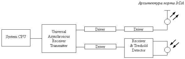 Сам порт IrDA основан на архитектуре коммуникационного СОМ-порта ПК, который использует универсальный асинхронный приемо-передатчик UART (Universal Asynchronous Receiver Transmitter) и работает со скоростью передачи данных 2400–115200 bps.
