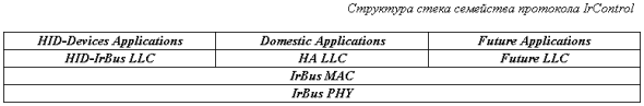 IrBus (IrControl). Спецификация, регулирующая вопросы, связанные с подключением различной периферии, требующей взаимодействия с системными контроллерами. Ее положения применимы также к устройствам удаленного управления ПК, телевизорами высокой четкости (HDTV) и бытовыми приборами.