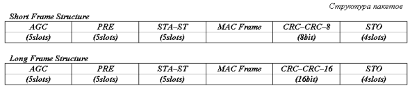 Максимальный квант передачи может быть равен 100, 200 или 500 ms. Он представляет собой максимальное время, в течение которого устройство передает данные до того, как перейдет к прослушиванию подтверждения приема и зависит от скорости передачи, емкости буфера в принимающем устройстве. Минимальная длительность передачи определяется неспособностью передающего устройства перейти к приему данных сразу после выдачи последнего бита. Дело в том, что усилитель PIN-диода в передающем устройстве входит в состояние насыщения от собственной передачи. Время восстановления приемника – переменная величина, составляющая 0.001–10 ms. Этот параметр для данного устройства должен быть заранее известен и учитывается в фазе переговоров об установлении соединения. Процедуры расширенного восстановления включают в себя функцию сброса, которая прерывает связь, но потом восстанавливает активное состояние с параметрами соединения, используемые по умолчанию.