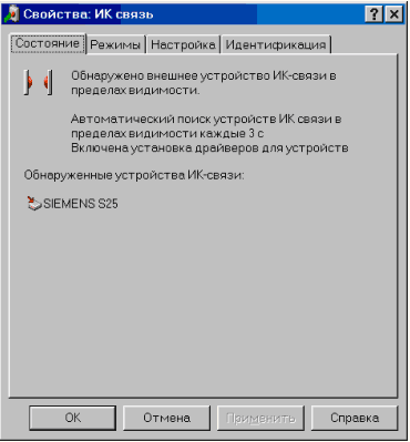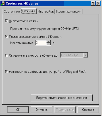 Среди всех настроек я бы выделил только "Режимы". Здесь вы сможете включить ИК-связь и установить время, через которое ИК-порт будет искать своих друзей в прямой зоне видимости. Параметр "Ограничение скорости обмена до:" можно отключить. Вот при каких настройках мой ИК-порт прекрасно работает: