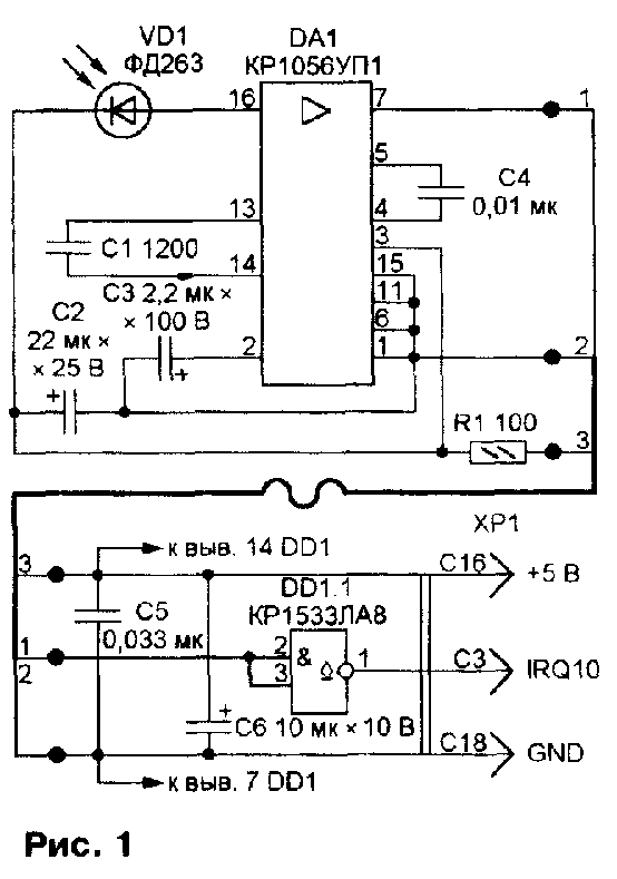 Приемник смонтирован на двух печатных платах. На первой (рис. 2) установлены фотодиод VD1, микросхема DA1, конденсаторы С1—С4 и резистор R1. Ее размещают на лицевой панели внутри системного блока компьютера (способ крепления значения не имеет), закрыв металлическим экраном, соединенным с общим проводом. Напротив фотодиода VD1 в корпусе компьютера сверлят отверстие для прохода И К лучей, которое можно закрыть светофильтром из красного органического стекла.