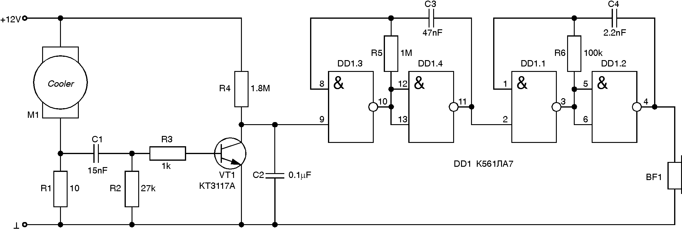 Устройство предназначено для подачи звукового сигнала при остановке вентилятора, охлаждающего центральный процессор ПК (т.е. кулера). Сигнализатор включается в разрыв кабеля питания кулера, размеры печатной платы 40x32.5 мм (умещается в спичечном коробке). Принципиальная схема сигнализатора изображена на рисунке 1