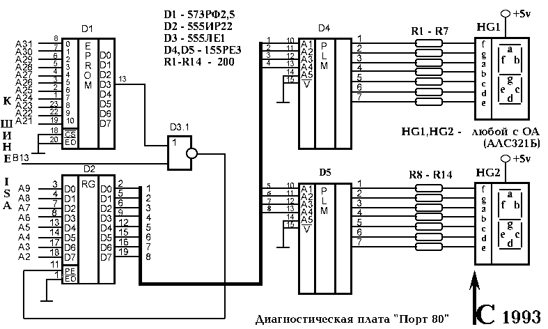 Диагностическая плата "Порт 80" предназначена для тестирования материнских плат ПК и в случае неисправности, позволяющая сделать заключение о причине. Базируется на том факте, что производителями материнских плат было принято решение выделить определенный физический адрес для диагностического порта, в который по мере загрузки BIOSa и инициализации различных устройств, находящихся на материнской плате, посылается определенный код. Эти коды, носящие имя POST codes, и позволяют узнать какое устройство инициализируется в настоящее время и удачно ли прошла эта инициализация. Наверняка проницательный читатель уже понял, что в названии этой статьи не зря присутствует цифра 80 - это как раз адрес диагностического порта в шестнадцатиричной системе счисления. Необходимо сказать, что хотя порт и стандартизован, производители BIOSa инициализируют устройства в разном порядке и коды, которые они посылают в этот порт то же не совпадают. Поэтому для каждого BIOSa существует своя таблица POST кодов. Найти ее можно на сайтах производителях AWARD, AMI, MRBIOS, PHOENIX. Или воспользоваться рускоязычным сайтом, посвященным исключительно BIOS-aм в различных их проявлениях: ic.doma.kiev.ua. Таблици POST кодов для всех !!! BIOS-ов: ic.doma.kiev.ua/inside.htm Там же кстати есть и описание работы с подобной платой: ic.doma.kiev.ua/hardware/port80/port80.htm. Нет только схемы самой платы. Этот досадный недостаток я и решил восполнить. Также, исключительно по просьбе представителей этого сайта, сообщаю, что я, так же как и разработка представленной тут платы, не имеем совершенно никакого отношения к вышеупомянутому сайту. Приведённая схема является исключительно моей интеллектуальной собственностью и ни в коей мере не базируется и не претендует ни на интеллектуальную ни на прочую собственность вышепреведённого сайта. Копирайт однако ;)