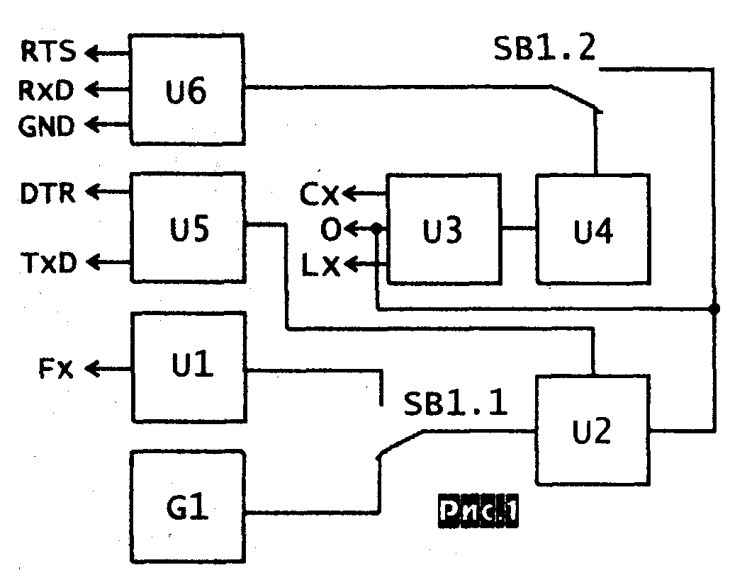 Функциональная схема устройства представлена на рис.1. Оно состоит из 6 узлов: входного формирователя импульсов U1, задающего генератора (1 МГц) G1, четырехдекадного делителя U2, узла измерения емкости и индуктивности U3, линейного преобразователя напряжения в частоту U4, узла управления декадным делителем U5 и узла приема данных U6. В режиме измерения частоты (SB1 включен) напряжение, подаваемое на гнездо Fx, преобразованное в прямоугольные импульсы формирователем импульсов U1, поступает на декадный делитель U2 и затем на узел приема данных. В режиме измерения индуктивности и емкости (SB1 выключен) образцовая частота с задающего генератора G1 поступает на декадный делитель U2, узел измерения U3, преобразователь U4 и на узел приема данных.