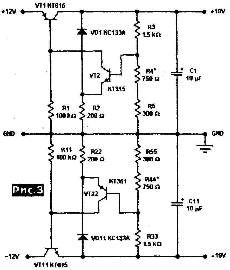Для питания измерителя используется стабилизатор рис.3 с защитой от перегрузки и короткого замыкания на выходе. Выходное напряжение 10 В, максимальный ток нагрузки стабилизатора 300 мА, при изменении тока нагрузки от 25 до 300 мА выходное напряжение изменяется менее чем на 0,2 В.