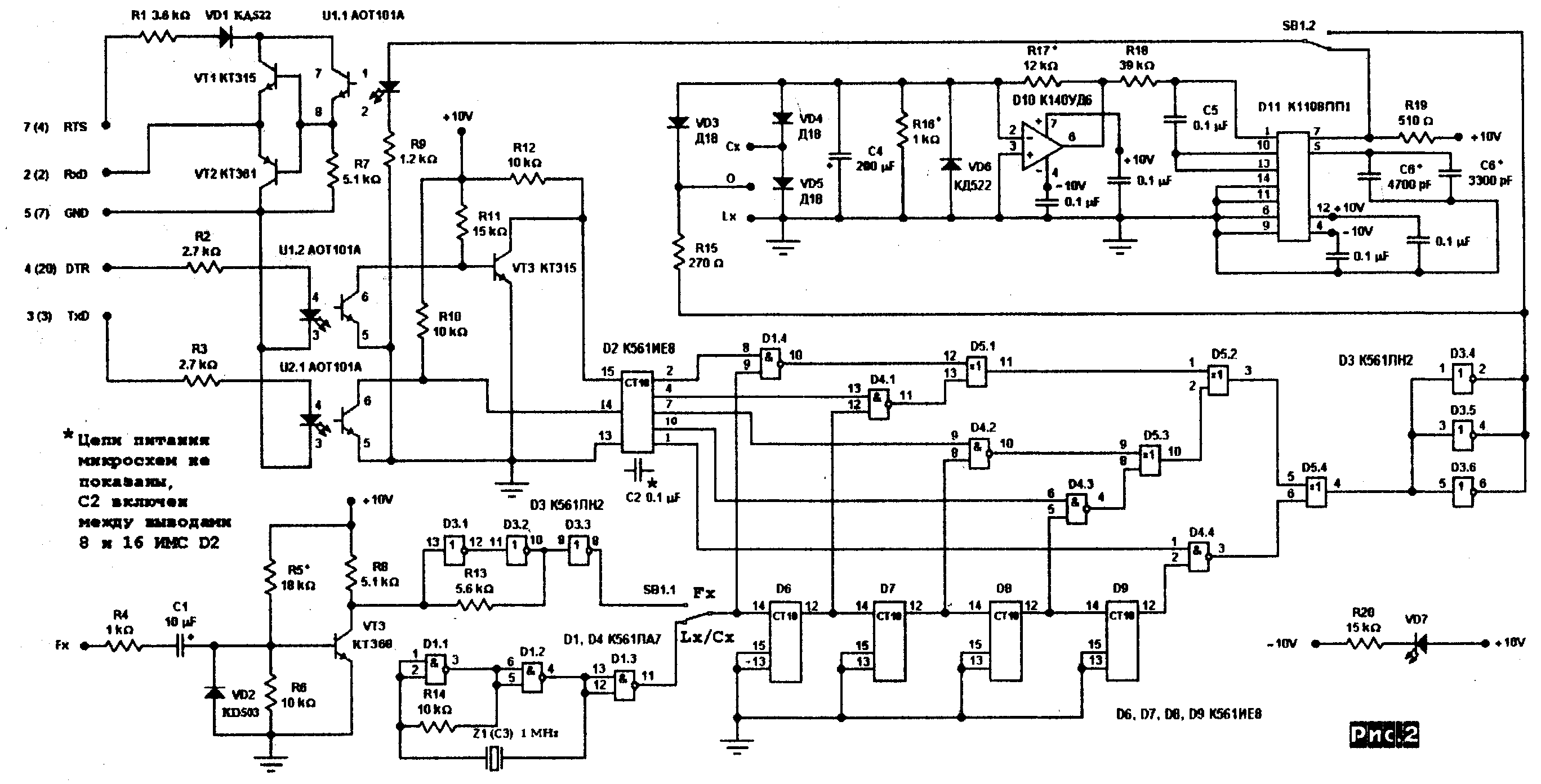 Электрическая принципиальная схема изображена на рис.2. Формирователь импульсов U1 состоит из усилительного каскада на транзисторе VT3 и триггера Шмитта на элементах D3.1, D3.2. Инвертор D3.3 улучшает форму импульсов, диод VD2 ограничивает отрицательное напряжение на эмиттерном переходе транзистора, предотвращая его пробой, резистор R4 ограничивает ток через диод при входном сигнале большого уровня. Задающий генератор G1 выполнен на элементах D1.1, D1.2, D1.3 и кварцевом резонаторе частотой 1 МГц (при небольшом увеличении погрешности измерений возможна его замена конденсатором емкостью 27-35 пФ). Декадный делитель U2 состоит из элементов D1.4, D5-D9, выбор диапазона осуществляется уровнем логической единицы с выходов микросхемы 02. В узле U3 напряжение, снимаемое с конденсатора С4, увеличивается до 0,1 - 10 В усилителем постоянного тока. Генератор управляемый напряжением с линейной характеристикой (узел U4) выполнен на микросхеме 1108ПП1. включенной по стандартной схеме преобразователя напряжения в частоту. В узлах U5 и U6 использованы оптроны для гальванической развязки СОМ-порта компьютера и измерителя.