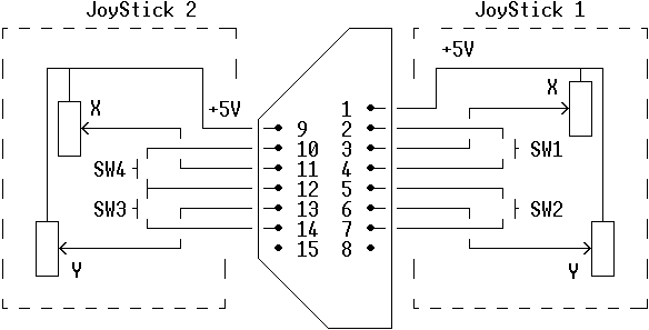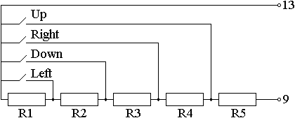 В любом из этих джойстиков стоят переменные резисторы, именно они преобразовывают движения рукоятки (руля) в сигналы понятные для компьютера. Резисторы нужны на 100КОм (подойдут и на 80КОм, и на 120КОм калибровка это исправит). Кнопки - любые, главное чтобы подходили по размерам. Схема подключения кнопок и резисторов к игровому порту: