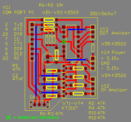 Маленькое дополнение, предлагаю вашему вниманию печатную плату "Анализатора", которую я разработал с помощью редактора Trax Maker