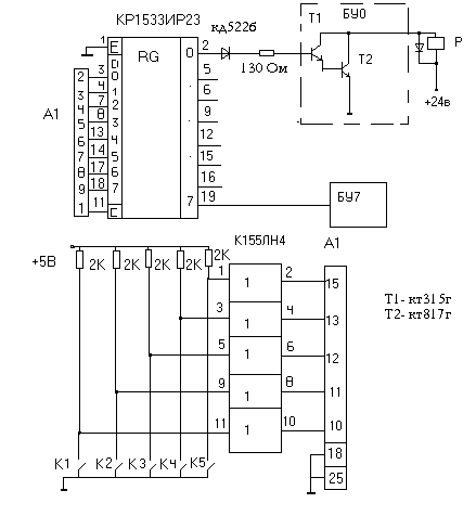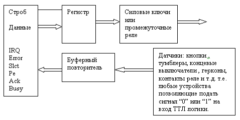 МС подключается к параллельному порту ПК стандартным "принтерным" кабелем Cetronix, обозначен на схеме - А1, с указанием контактов разъема адаптера. Датчики К1-К5 работают на замыкание. Микросхема К155ЛН4 служит для некоторой защиты адаптера от неблагоприятных внешних воздействий (в случае чего, проще заменить одну микросхему, чем весь адаптер). Можно использовать и другие элементы типа ЛН той же серии, например 155ЛН1, 155ЛН2, но в таком случае при обработке сигнала надо будет учитывать инверсию. При замыкании одного из ключей К1 на соответствующем входе логического повторителя высокий уровень сменяется низким, и на вход адаптера поступает сигнал изменения внешнего воздействия и заносится в порт 379Н, либо в 37АН (сигнал "разрешение прерывания") и затем обрабатывается программой. В ответ на внешние воздействия компьютер в соответствии с алгоритмом вырабатывает управляющие сигналы. Управляющая информация записывается по шине данных в регистр RG после прохождения стробирующего сигнала на вход С микросхемы КР1533ИР23. ТТЛ выход регистра защищен диодами КД522Б и резистором номиналом 130 Ом. Затем сигнал усиливается блоком усиления БУ0-БУ7, собранным в виде транзисторного ключа на элементах Т1,Т2. Напряжение питания на транзисторный ключ подается в зависимости от применяемого реле от +5 до +24В. Реле РП21 или аналогичные. Напряжение питания микросхем +5В. Вот и вся аппаратная часть. Можно приступать к программному обеспечению.
