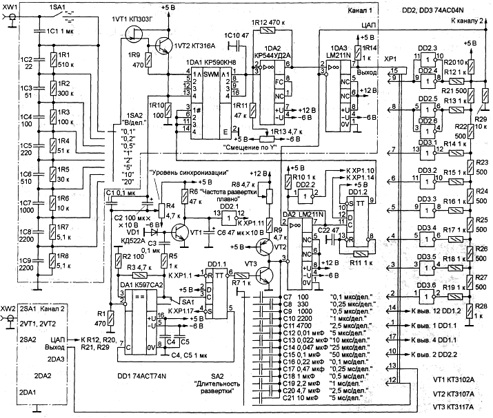 Синхронизация осуществляется в канале 1 с помощью компаратора DA1, инвертирующий вход которого через конденсаторы С1 и С2 подключен к выходу повторителя на транзисторах 1VT1 и 1VT2. Для повышения помехоустойчивости введены резисторы R2 и R3, задающие компаратору гистерезис 20 мВ. Уровень синхронизации регулируют переменным резистором R4.