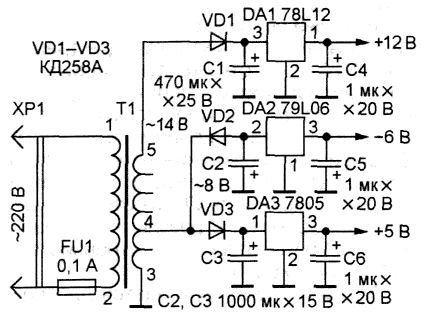 Программа написана на языке Turbo Pascal. В ней реализовано быстрое преобразование Фурье (спектроанализатор). Преобразовывается сигнал, изображенный на экране. Для того чтобы спектр был показан правильно, необходимо, чтобы на экране укладывалось целое число периодов сигнала. Этого можно добиться, подбирая длительность развертки переменным резистором R8. Подпрограмма быстрого преобразования на языке Фортран приведена в [2]. Там же можно найти пояснение способа определения спектра сигнала через преобразование Фурье. Для питания приставки необходим источник стабилизированных напряжений +12, +5, и -6 В. Потребляемый ток по цепям +12 и -6 В не превышает 50, по цепи +5 В - 150 мА. Уровень пульсаций не должен превышать 1 мВ. Можно использовать блок питания (адаптер) китайского производства на 3...12 В, 1А, доработав его, как показано на рис. 2.