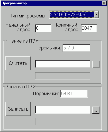 Файл для записи в ПЗУ должен быть в готовом двоичном формате. Запись начинается с адреса, установленного в поле "Начальный адрес", и заканчивается либо по окончании файла либо когда значение адреса превысит значение, установленное в поле "Конечный адрес".