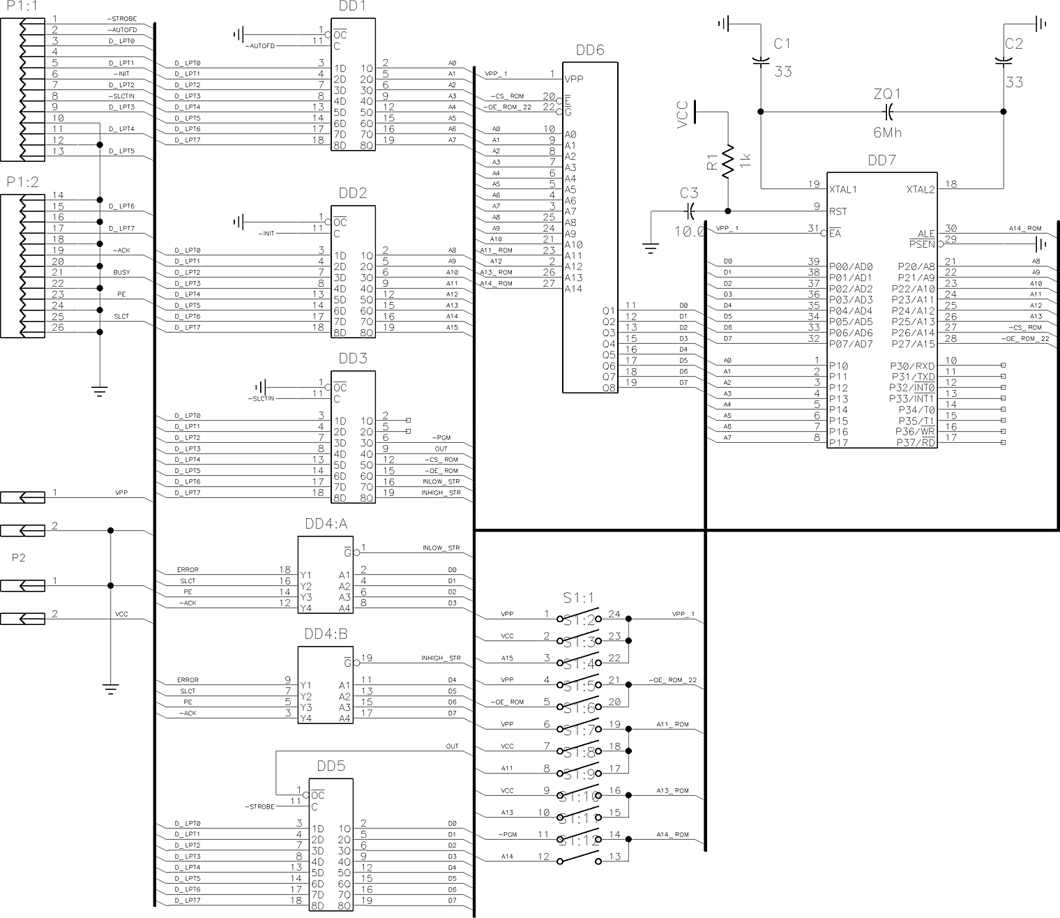 Регистры DD1, DD2 предназначены для установки адреса ПЗУ. DD1 устанавливает младшие разряды адреса, DD2 - старшие. Запись в эти регистры происходит через шину данных LPT по переднему фронту управляющих стробов -AUTOFD и -INIT соответственно.