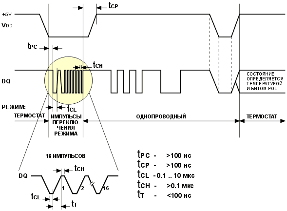 При следующем после программирования включении питания режим работы DS1821 будет определяться битом T/R регистра статуса. Если он установлен, DS1821 будет работать в режиме термостата. В этом режиме DS1821 не может вести обмен по однопроводной шине. Поэтому никакими командами, передаваемыми по шине, вывести DS1821 из режима термостата невозможно. Для осуществления этой операции предусмотрена специальная процедура, с помощью которой можно временно перевести DS1821 в однопроводной режим, что позволяет, например, изменить пороги термостата. Если же при этом сбросить бит T/R, то при следующем включении питания DS1821 уже больше не будет находиться в режиме термостата. Для перевода DS1821 в однопроводной режим из режима термостата необходимо на вывод питания подать 0В в то время, когда вывод данных находится в состоянии высокого логического уровня. Затем на вывод данных нужно подать 16 импульсов. После этого можно снова подать питание, и DS1821 окажется в однопроводном режиме. Если указанную процедуру повторить, то DS1821 снова перейдет в режим термостата.
