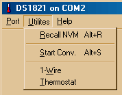 Меню Utilites в основном дублирует кнопки основного окна. Имеется только один новый пункт: Recall NVM. Он позволяет считать из DS1821 значения TH и TL, которые в нем сохранены. Для этого DS1821 должен находиться в однопроводном режиме.