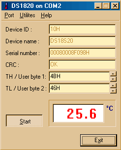 Окно вверху имеет меню, состоящее из трех пунктов: Port, Utilites и Help. Меню Port и Help, а также структура ini-файла идентичны описанным выше для программы ds1821.exe. Меню Utilites содержит три пункта: